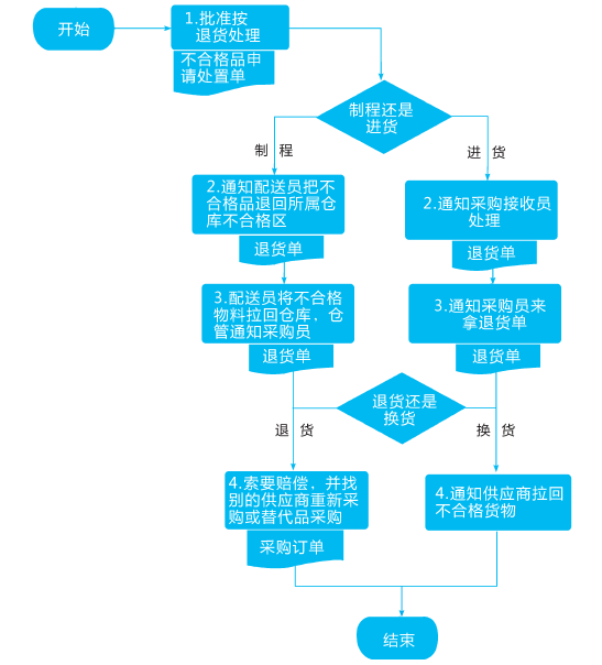 退货处理是指采购人员依据采购合同规定的由于某些因素而把所采购的货物退还给供应商或者供应商调换的一种违约处理方式。退货处理的$7般流程如图所示。