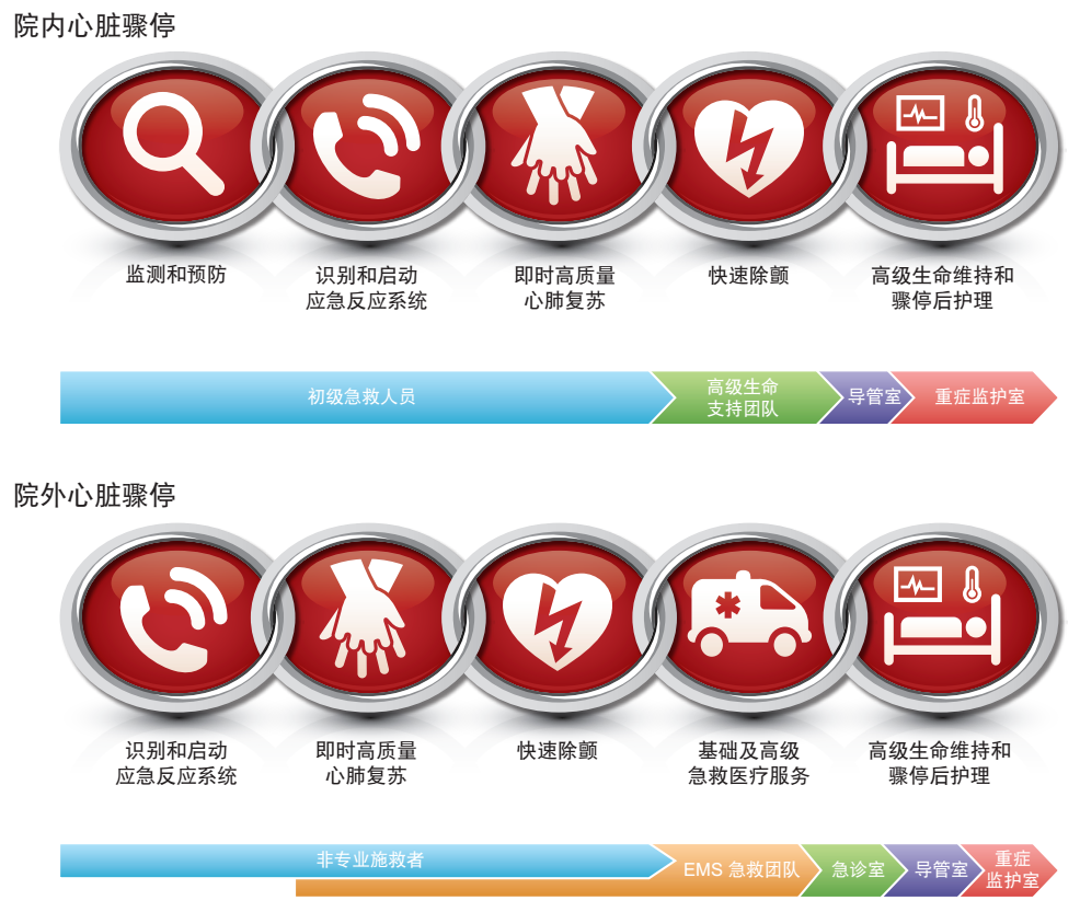 如果发生心脏骤停,患者依赖于医疗机构各个部门和服务间的顺畅沟通,以及由专业医疗人员,包括医生、护士、呼吸治疗师等组成的多学科团队。生存链中各个环节必须环环相扣,中断任何一个环节,都可能影响患者的预后。