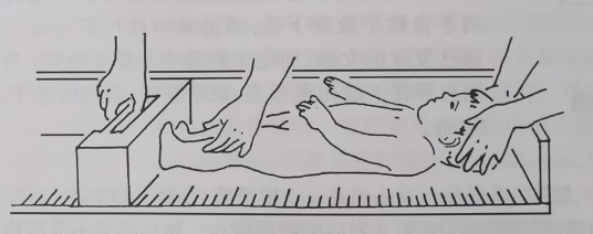 (3)协助小儿脱去帽、鞋、袜,仰卧于测量板的中线上。