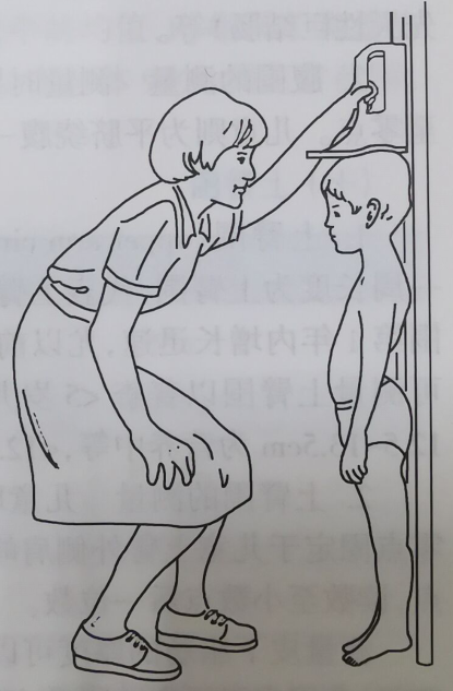 (3)嘱儿童取立正姿势,双眼平视正前方,两手自然下垂,脚跟靠拢,脚尖分开60°,脚跟、臀部、肩胛骨以及枕部同时靠在测量杆上。