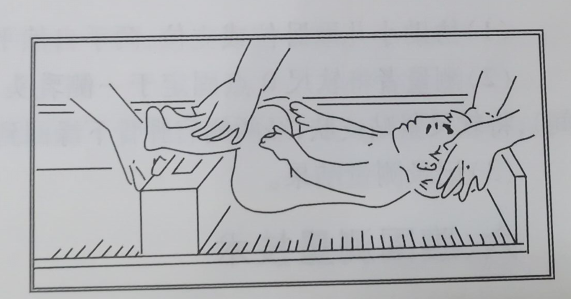 (3)协助婴幼儿脱去帽、鞋、袜,仰卧于测量板的中线上。