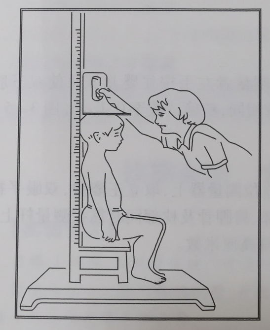 (2)协助儿童脱去帽、鞋、袜,坐于坐高计的坐盘上,身躯先前倾使骶部紧靠立柱,在挺身坐直,两大腿伸面与身躯成直角而与地面平行,大腿与凳面完全接触,并相互靠拢,膝关节屈曲成直角,两脚平放在地面上。测量者下移头板使与头顶接触,精确读数至0.1cm$2图2-9$3。