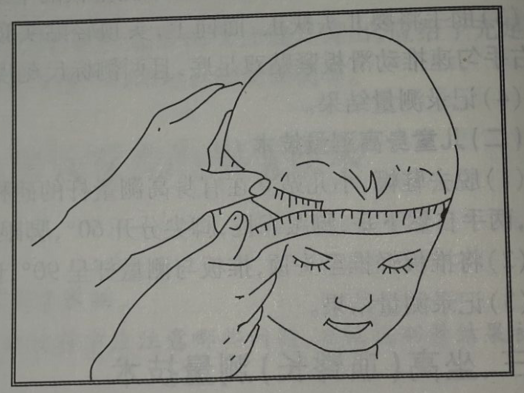 2.协助儿童取坐位或立位,测量者立于儿童右侧或前方,测量者用左手拇指将软尺零点固定于儿童右侧眉弓上缘处,软尺从其头部右侧经枕骨粗隆最突出处再经左眉弓回到零点,精确读数至0.1cm$2图2-10$3。