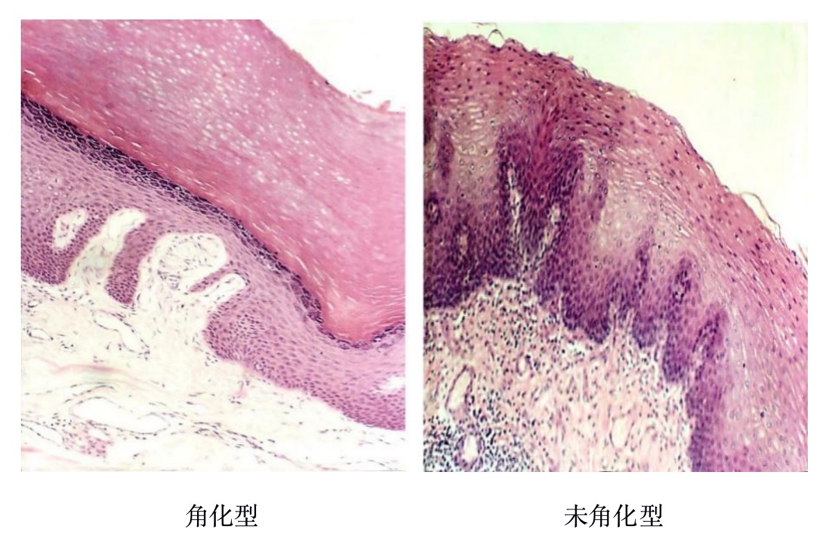 1.复层扁平上皮(stratified squamous epithelium) 又称复层鳞状上皮。上皮与深部结缔组织的接触面凹凸不平,使两者之间的接触面积增加,保证了上皮组织的营养供应,并使连接更加牢固。紧靠基膜的一层细胞为立方形或矮柱状,具有分裂增殖能力,并向表层推移。位于皮肤表面的复层扁平上皮,称角化的复层扁平上皮(keratinized stratified squamous epithelium),浅层细胞无核,胞质中充满角蛋白,具有较强的保护作用;衬贴在口腔和食管等腔面的复层扁上皮,浅层细胞有核,含角蛋白少,称未角化的复层扁平上皮(nonkeratinized stratified squamous epithelium)(图2)。