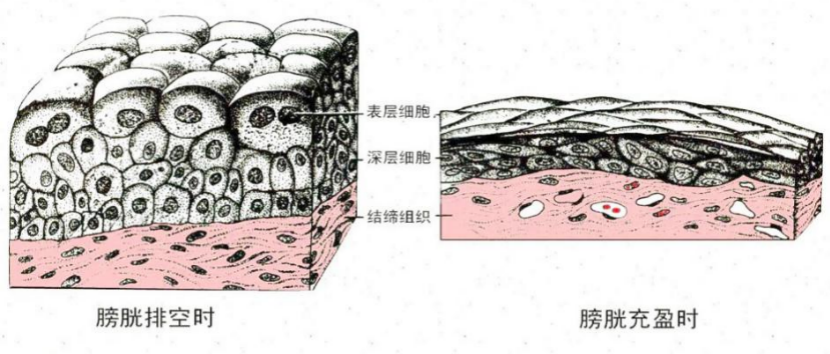 2.变移上皮(transitional epithelium) 又名移行上皮、衬贴在排尿管道(肾盂、输尿管和膀胱)的腔面。变移上皮的细胞形状和层数可随所在器官的收缩与扩张而发生变化。如膀胱空虚缩小时,上皮变厚,细胞层数较多,此时表层细胞呈大立方形;当膀胱充盈扩张时,上皮变薄,细胞层数减少,细胞变扁(图3)。