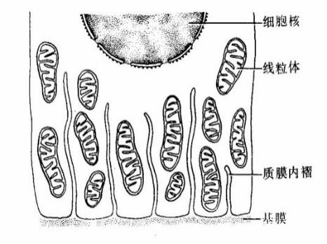 2.质膜内褶(plasma membrane infolding) 由上皮细胞基底面的质膜向细胞内凹陷形成,主要作用是扩大细胞基底部的表面积,有利于水和电解质的迅速转运(图7)。