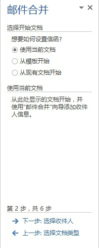 ⑤单击“下一步:正在启动文档”超链接,进入“邮件合并分步向导”的第2步,在 “选择开始文档”选项区域中确定邮件合并的主文档,可以使用当前打开的文档,也可以选择一个已有的文档或根据模板新建一个文档。(图2)