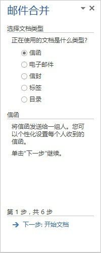 ③从弹出的下拉列表中选择“邮件合并分步向导”命令,打开“邮件合并”任务窗格,同时进入“邮件合并分步向导”的第1步。(图1)邮件合并向导共包含6步。
