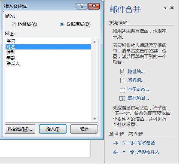 ⑥在“邮件”选项卡上单击“编写和插入域”组中的“插人合并域”按钮,从下拉列表中选择插入的域名