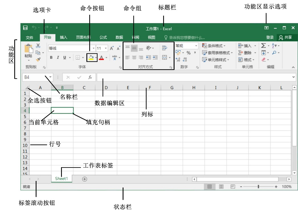 Excel启动后,即打开Excel应用程序工作窗口(图1),Excel应用程序工作窗口由标题栏、位于窗口上部呈带状区域的功能区、下部的工作表窗口以及状态栏组成。功能区包含一组选项卡及相应命令:工作表区包括名称栏、数据编辑区、工作表区、状态栏等。选项卡中集成了相应的操作命令,根据命令功能的不同每个选项卡内又划分了不同的命令组。