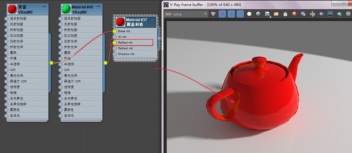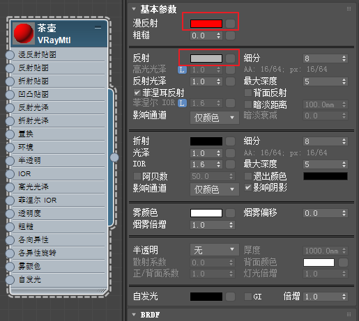编辑一个茶壶材质,如图5.4.21所示做简单的设置即可,颜色为纯度很高的红色,反射亮度大概调整到125。