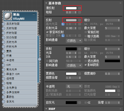 编辑一个地面材质,如图5.4.22所示做简单的设置即可,颜色为纯白色,反射亮度大概调整到125。