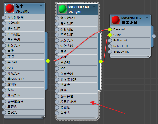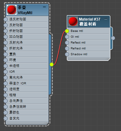 但如果你想人为控制有所不同的话,可以建立一个“覆盖材质”,并把茶壶材质制定给覆盖材质的“基础材质”,再把“覆盖材质”指定给茶壶物体。如图5.4.24所示。