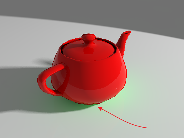 再一次渲染就可以得到如图5.4.26所示,红色的茶壶产生的色溢竟然是绿色的。