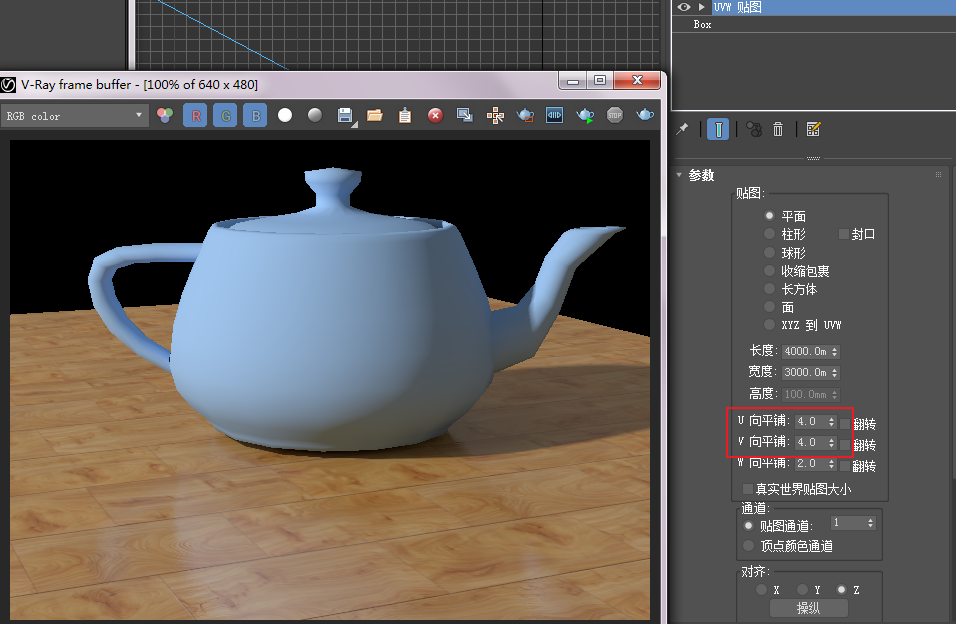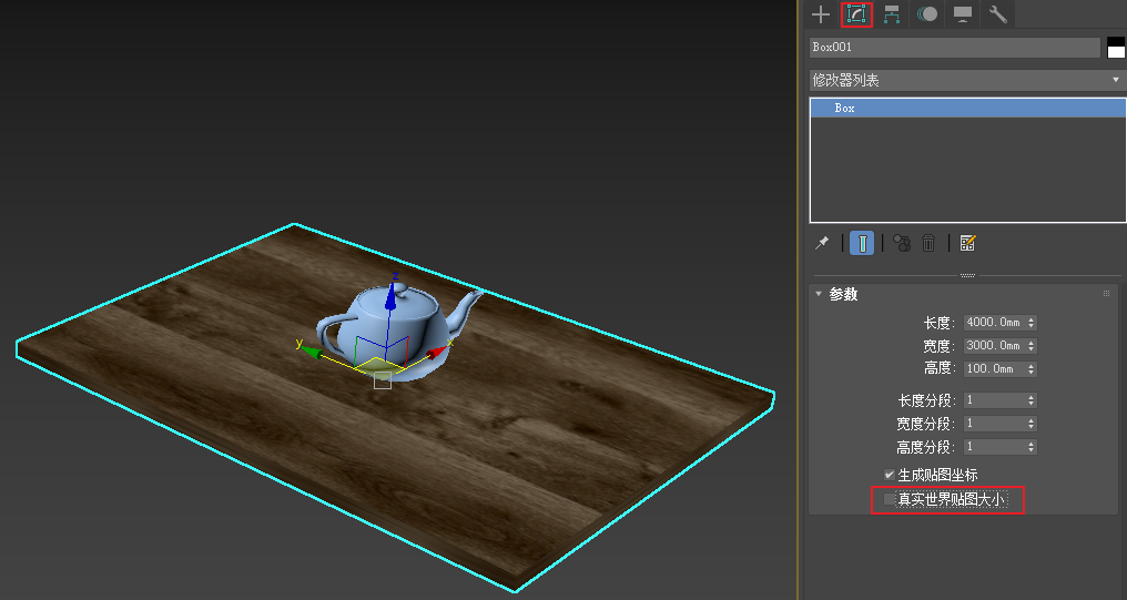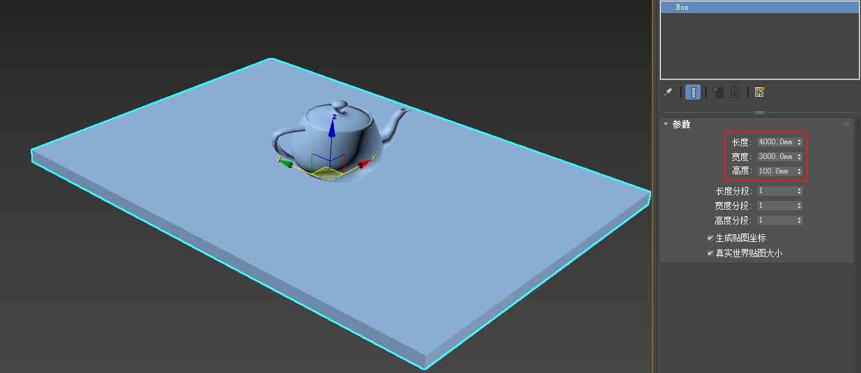创建一个BOX物体,参数如图5.6.12所示,模仿房间地面。在地面之上再创建一个茶壶,模仿地面之上的物体。