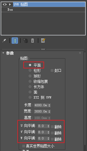 选择“平面”贴图坐标调整贴图的平铺次数,直到贴图大小满意为止。如图5.6.17所示。