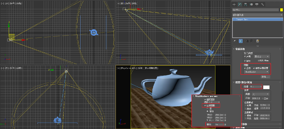 如果这个时候渲染的话画面会比较暗,因为场景中只有微弱的环境光。给场景按如下的参数添加一盏目标聚光灯。阴影类型启用VRAY阴影,强度为0.1,启用区域阴影,细分设置为24。如图5.6.18所示。