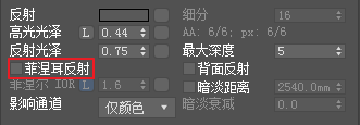 先解决第一个问题,地板的反射。进入材质编辑器,先把菲涅尔反射勾选去除,渲染之后反射明显增强。如图5.6.20所示。