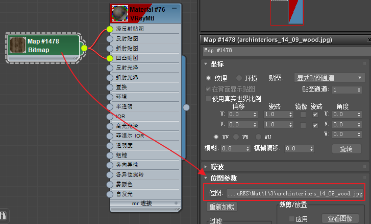 这时发现贴图并没有真正显示出来,放大视图后发现是因为贴图太小了。所以导入进来的材质即使任何材质的参数都不去调整,至少贴图坐标是需要调整的。如图5.6.14所示。