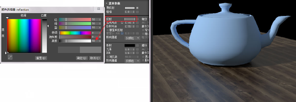 反射还可以继续增强一些,把反射的颜色两度值改成50左右,这个强度感觉差不多。如图5.6.22所示。