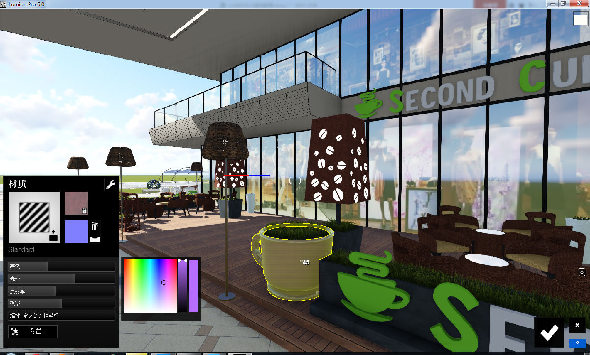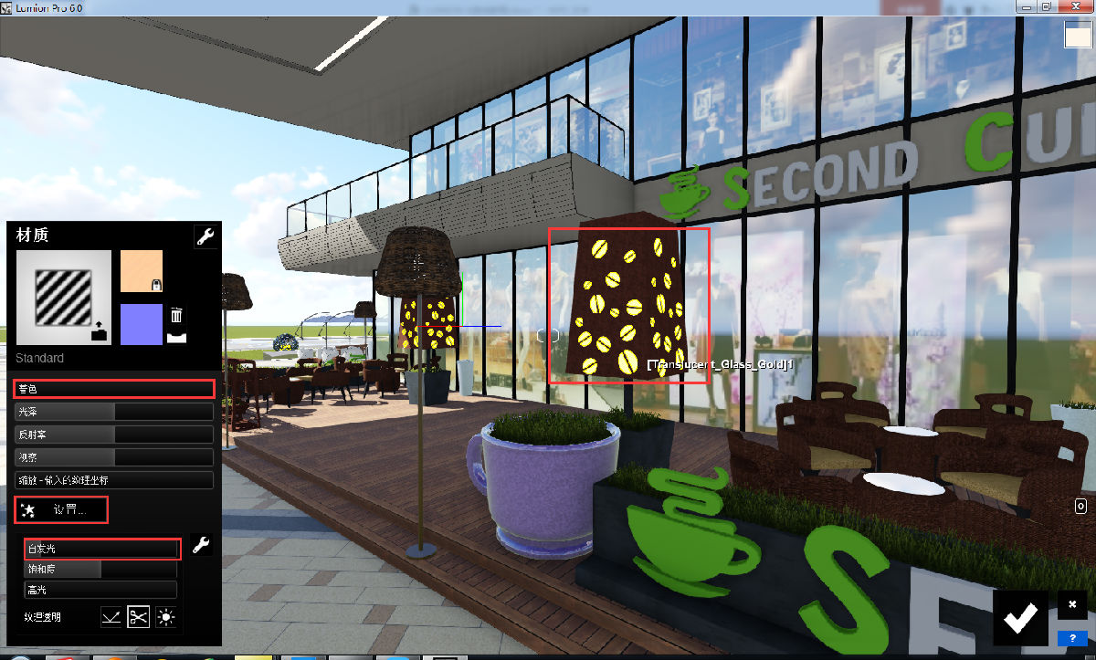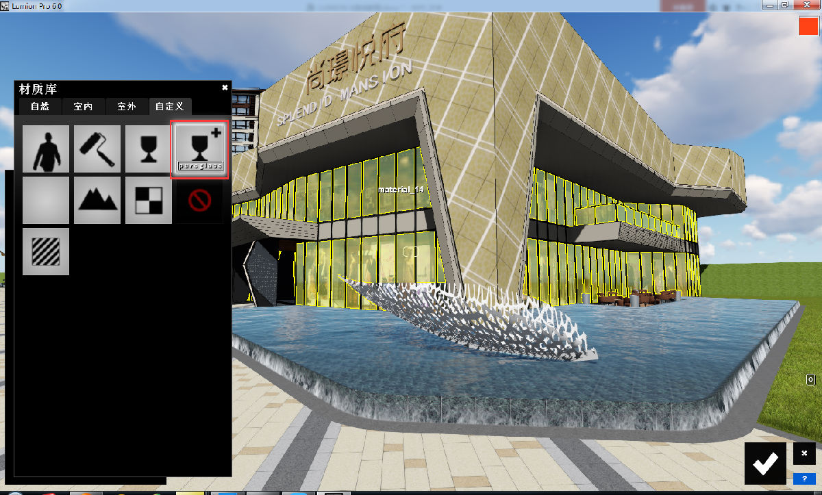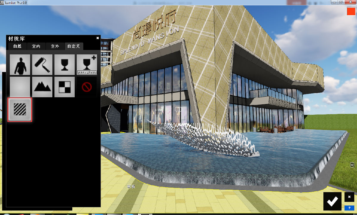小贴士:水面材质应该在增加反射特效后在特效模式下细致调节,而且由于日景和夜景玻璃反射和透明度的不同,在夜景和日景需调节不同参数。