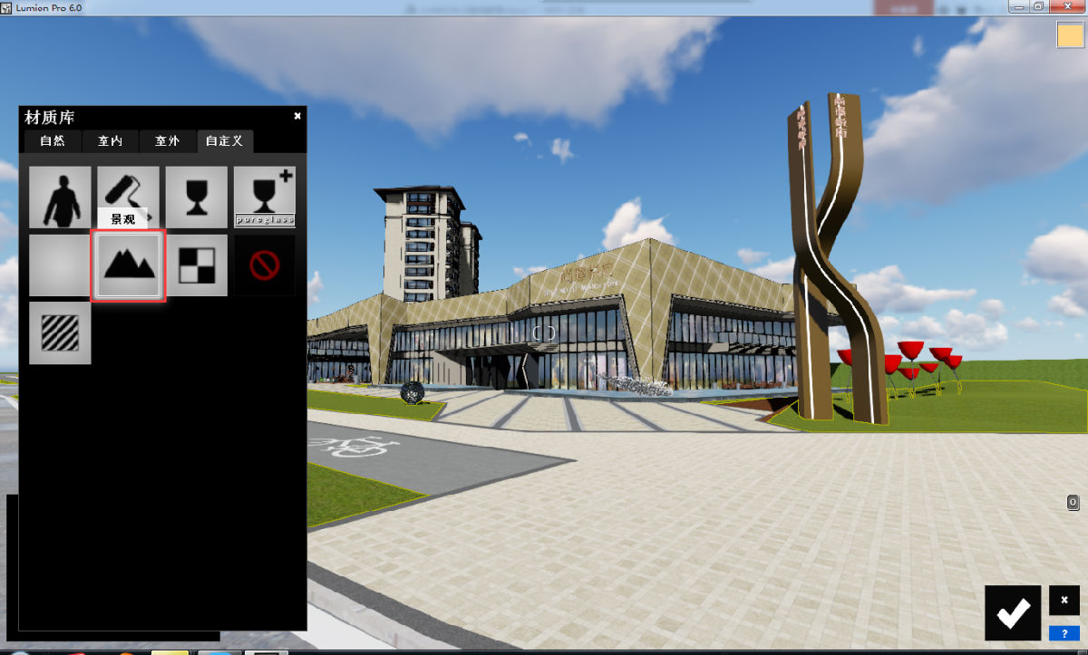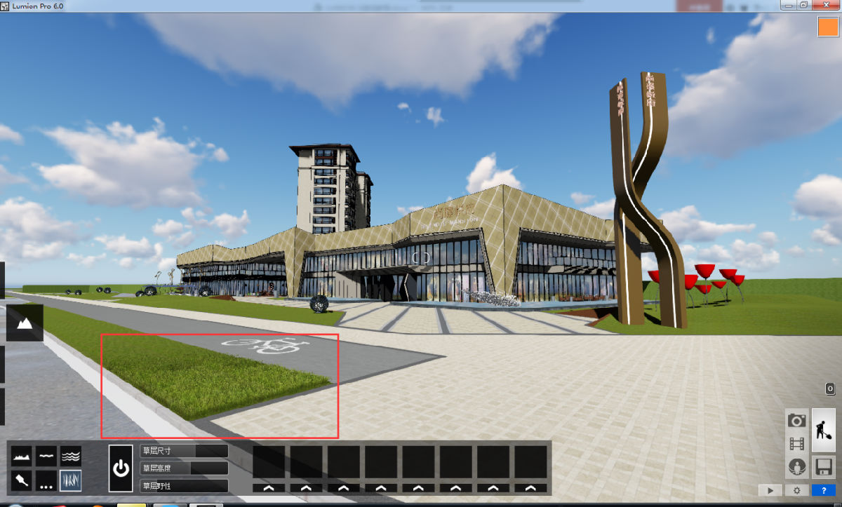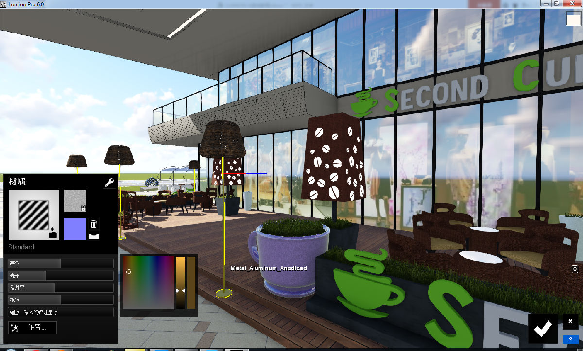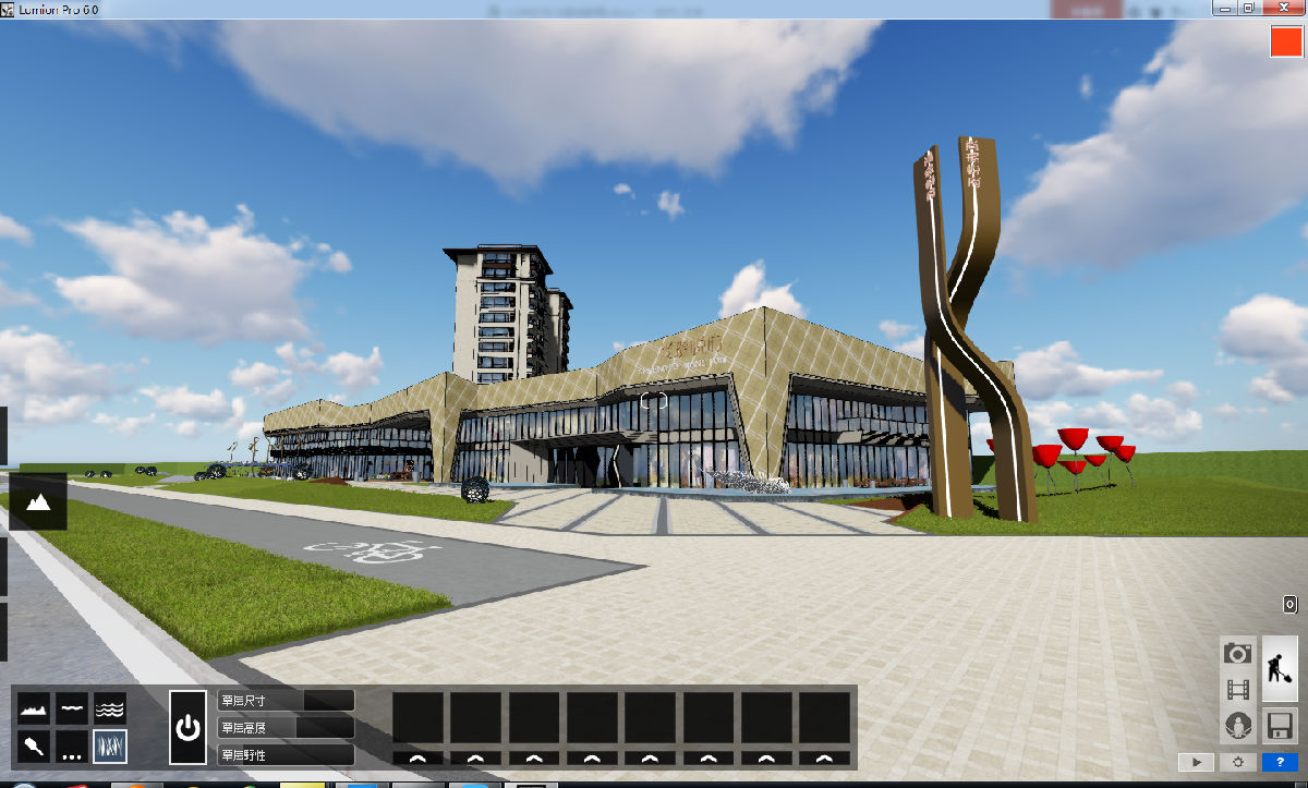 小贴士:水面材质应该在增加反射特效后在特效模式下细致调节,而且由于日景和夜景玻璃反射和透明度的不同,在夜景和日景需调节不同参数。