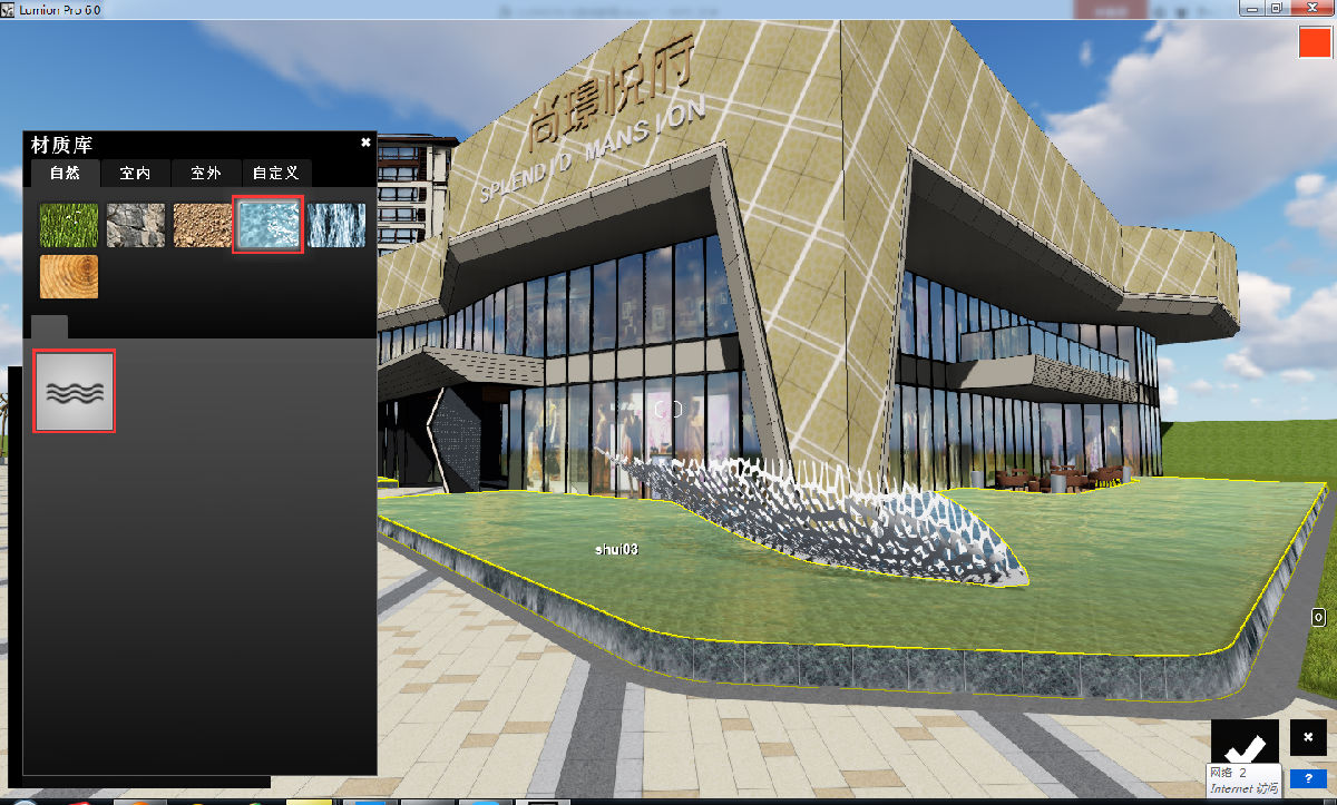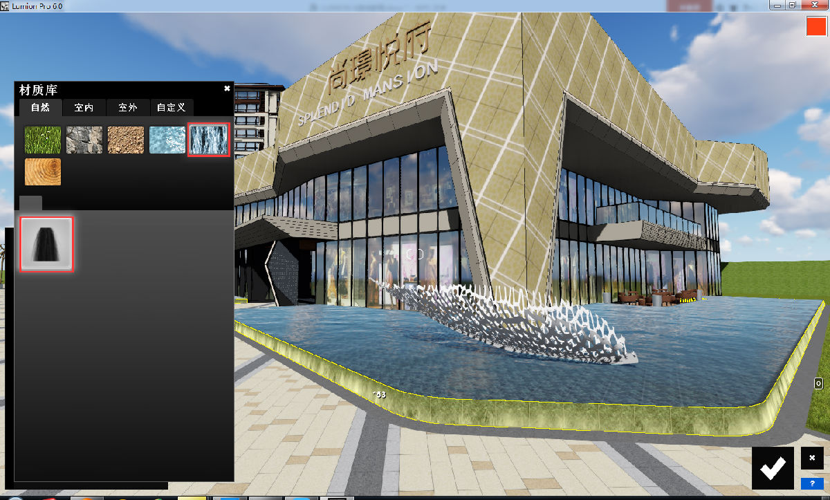 小贴士:平面水和立面水材质应在模型中区分。水面材质应该在增加反射特效后在特效模式下细致调节。