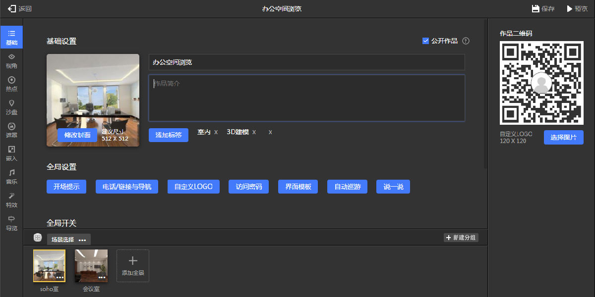 在基础工具界面(如图9.3.8所示)可以进行一些基础设置,主要有修改封面画面、输入作品简介、上传自定义的logo、添加标签等。开通商业用户之后,还可以设置访问密码,添加自己的网址等操作。