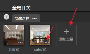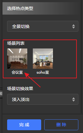下面会出现全景列表,也就是“全局开关”中的所有全景,点击“会议室”全景。点击完成。这样就实现了从soho室场景切换到会议室全景的热点设置。如图9.3.14所示。