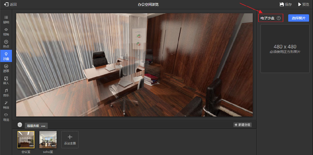 电子沙盘功能,如图9.3.16所示。可以上传地图或户型图,以电子沙盘的方式来进行导览。点击电子沙盘可以进入视频讲解。