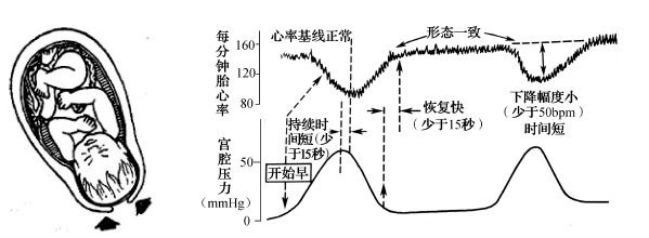 早期减速(ED):特点是胎心率曲线下降与宫缩曲线上升同时发生。胎心率曲线最低点(波谷)与宫缩曲线顶点(波峰)相一致,子宫收缩后迅即恢复正常,下降幅度<50bpm,时间短,恢复快。早期减速是宫缩时胎头受压,脑血流量一时性减少(无伤害性)的表现,不受孕妇体位或吸氧而改变。