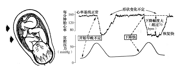 变异减速(VD):特点是胎心率减速与宫缩无固定关系。一旦出现,下降迅速且下降幅度大(>70bpm),持续时间长短不一,恢复也迅速。变异减速一般认为系因子宫收缩时脐带受压兴奋迷走神经所致。