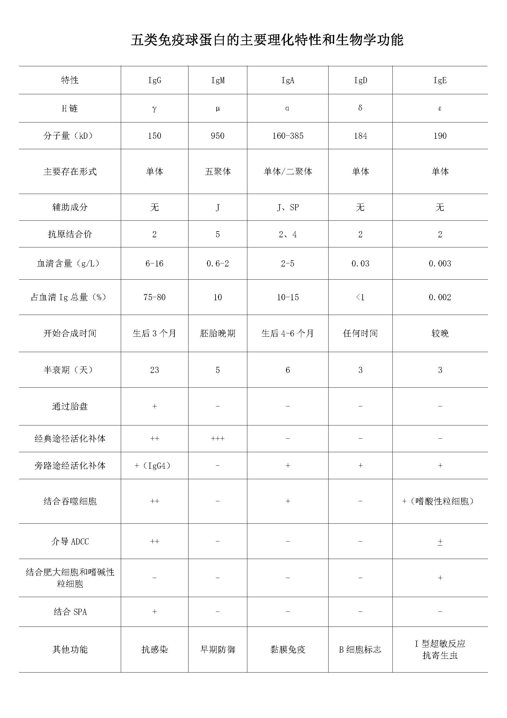 五类免疫球蛋白的主要理化特性和生物学功能