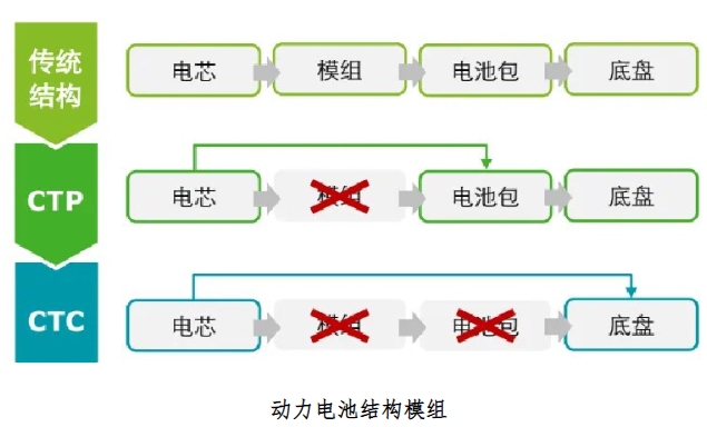 除材料迭代以外,结构革新是动力电池另一条重要的技术发展路径。传统新能源汽车动力电池系统一般是“电芯-模组-电池包”三级装配模式。但模组配置方式的空间利用率只有40%,很大程度限制了其他部件的空间。因此,各大厂商在电芯、模组、封装方式等方面进行结构上的改进和精简,以提升电池的系统性能。电池一体化(CTP、CTC、CTB)的发展逐渐成为行业的重点研究、应用方向,如下图所示。