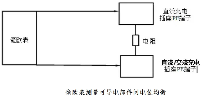 (3)测量电位均衡(可导电部件间)时,将毫欧表的两个探针分别连接直流充电插座的PE端子和交流充电插座(对于仅有2个直流充电插座的车辆,为直流充电插座)的PE端子,增大测试电流,使测试电流至少达到0.2 A,读取测量结果,如下图所示。