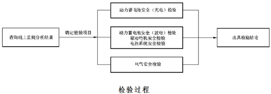 如车辆出现与动力蓄电池、驱动电机、电控系统、电气安全有关的报警信号时,应停止检验。检验过程如下图所示。