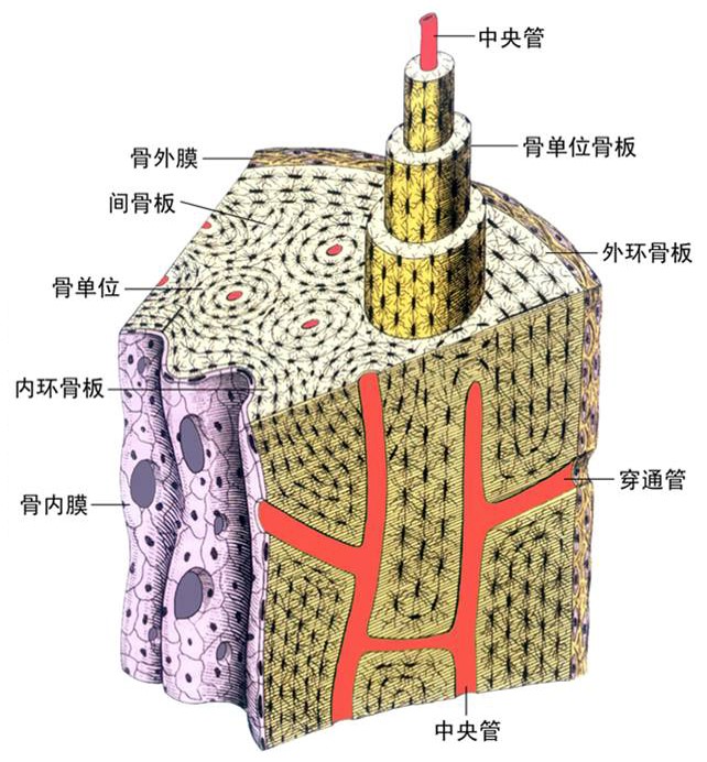 骨干主要由骨密质构成,骨髓腔面有少量骨松质。骨密质在骨干的内、外侧形成平行排列的环骨板,在环骨板之间为骨单位和间骨板。骨骺主要由骨松质构成,表面有少量骨密质,与骨干的骨密质相连续。骨骺的关节面为透明软骨,骨松质内的小腔隙与骨髓腔相通,内含红骨髓。骨膜除关节面外,骨的内、外表面均覆有骨膜,分别称为骨内膜和骨外膜,骨内膜还分布于中央管以及骨小梁的表面。骨内膜和骨外膜均由结缔组织构成,内有丰富的血管、神经和骨祖细胞。骨膜中的骨祖细胞可分化为成骨细胞或者成软骨细胞,故骨膜对骨质具有保护、营养和修复等功能。临床上可利用骨膜移植,治疗骨折或者软骨和骨的缺损疾病。骨外膜内的胶原纤维束还形成穿通纤维穿入骨质内,起固定骨膜和韧带的作用。