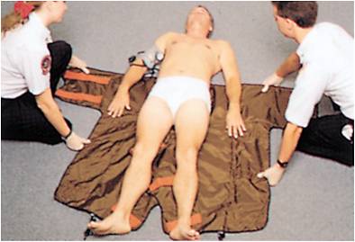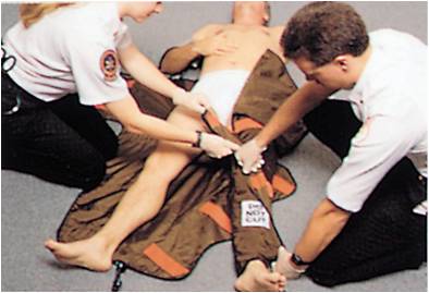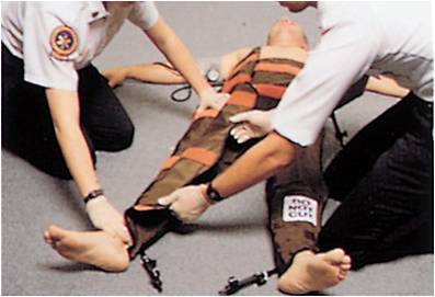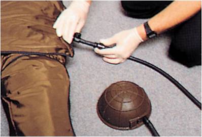 使用时将其打开,从伤病员的侧身垫入身后,将腹部片及双下肢片分别包裹腹部和双下肢。上缘必须达到剑突水平,以便充气发挥其作用,下缘可连踝部。充气方法可用口吹,或用打气筒或氧气瓶充气。囊内压力一般在5.33 kPa,可显示明显效果。