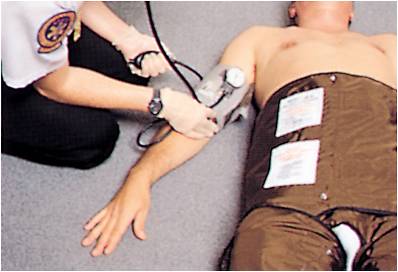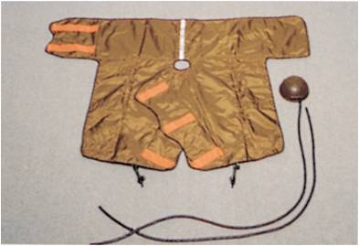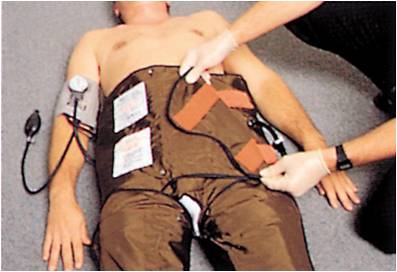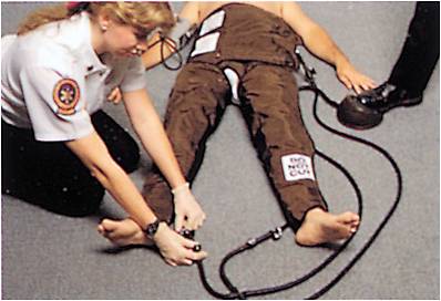 抗休克裤利用充气加压原理研制而成。用它来处理失血性休克及其他原因引起的休克及制止腹内和下肢活动性出血等方面,显示出它独特的功效,成为院前和医院急救复苏中不可缺少的装备,近20年来在世界范围得到了广泛应用。现场穿抗休克裤,只需一到两分钟,可使自身输血达750至1500毫升,迅速纠正休克。
