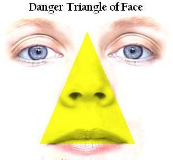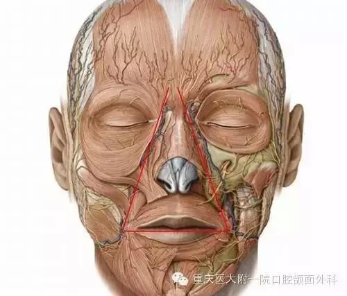 面部危险三角区,通常指的是两侧口角至鼻根连线所形成的三角形区域。通俗的说是从鼻根到两口角,这个区域是公认的危险区域当面部发生炎症,尤其在这三角区域内有感染时,易在面前静脉内形成血栓,影响正常静脉血回流,并且逆流至眼上静脉,经眶上而通向颅内蝶鞍两侧的海绵窦,将面部炎症传播到颅内,产生海绵窦化脓性,血栓性静脉炎的严重并发症。