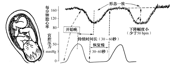 晚期减速(LD):特点是胎心率下降的起点常落后于宫缩曲线上升的起点,多从波峰处开始,胎心率曲线减速的波谷落后于宫缩曲线的波峰,时间差多在30~60秒,下降幅度<50bpm,胎心率恢复水平所需时间较长。晚期减速一般认为是胎儿缺氧的表现,应引起高度注意。