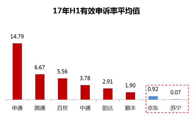首先从配送质量来看,即邮政局公布的申诉率数据看,近半年京东和苏宁电商自建物流有明显的优势,百万件有效申诉件数在1以内,近乎完美,就算快递业界标杆的顺丰都要望其项背: