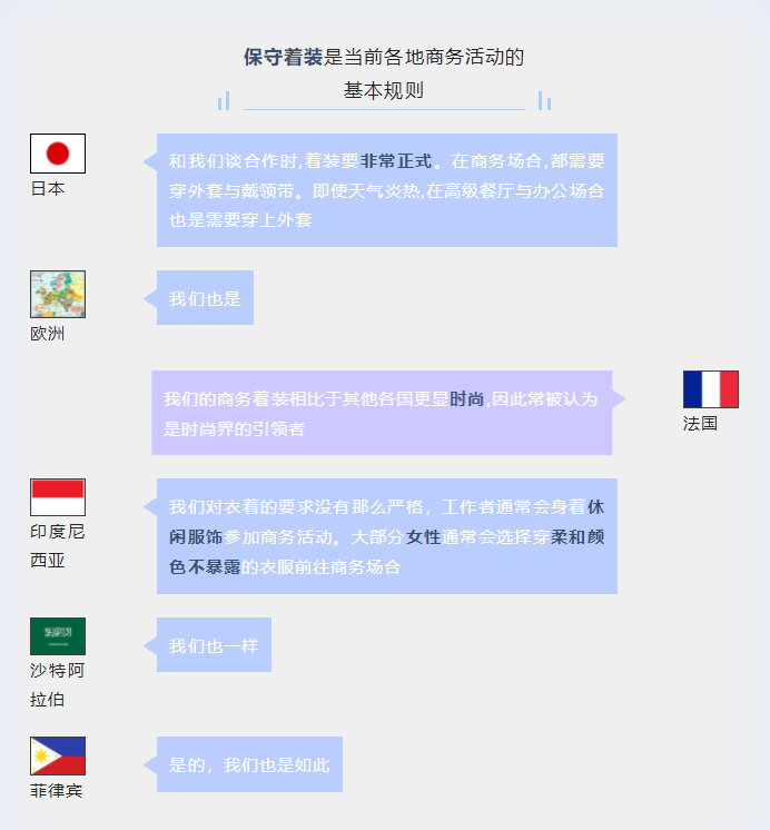 着装要符合一定的场合、时间、地点、天气、文化以及要会面的人对你的期望。